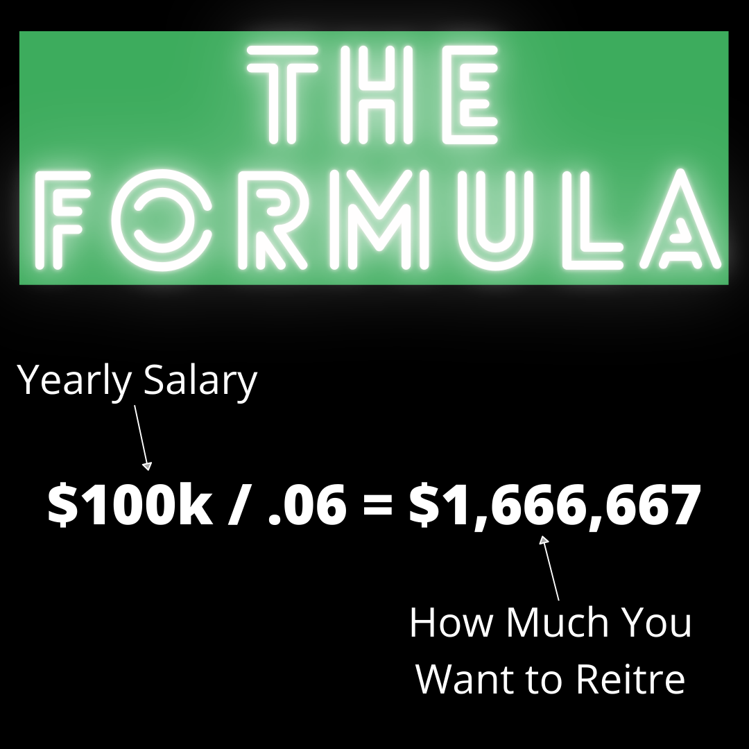 But why does this formula work? It's based off of the concept that you're going to withdraw 6% a year off of your nest egg. What's a nest egg? For example you have $1 million in a 401k. The million dollars is your nest. That $1m stays invested for the rest of your life and you live off of the interest that the $1m brings. The stock market does a little over 10% per year on average. Therefore, that $1m will bring in a bout $100k of interest every year. Now we don't want to take out the full amount of money that your nest egg is bringing in because you have to account for things like inflation. Which on average has been 2% to 2.5% per year. So you don't withdraw the 10%, you withdraw 6% to account for inflation and stock market fluctuation. Some people who are more conservative will withdraw 4% per year and some people who are more aggressive will withdraw 10% per year. I recommend 6% because it's conservative enough your nest egg will continue to survive the rest of your life and it's aggressive enough that you can actually live off and enjoy the money you saved.